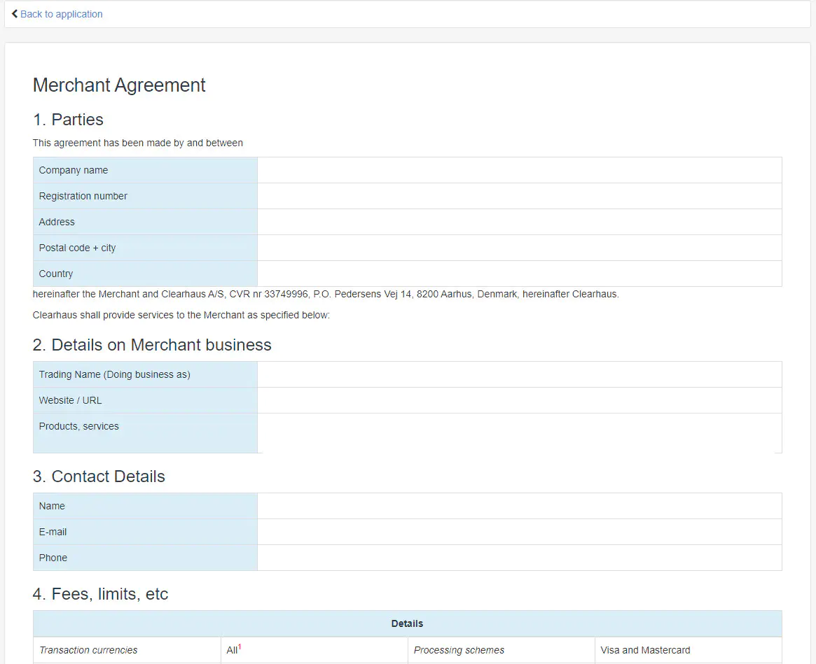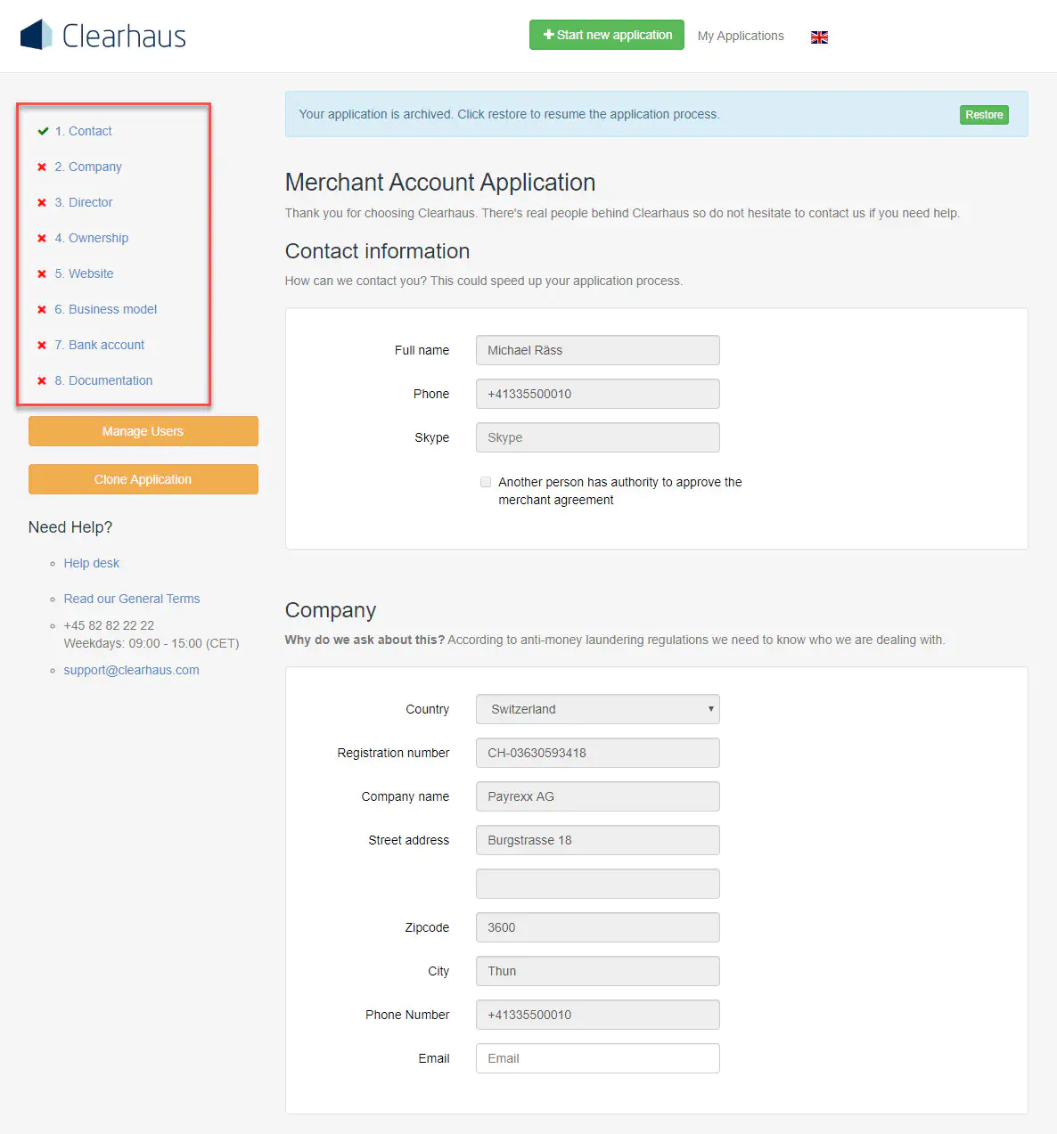 - Danach müssen Sie die verlangten Daten eingeben. Links (siehe roter Kasten) sehen Sie eine Übersicht, der Informationen, die Sie angeben müssen. Dies sind Kontaktdaten, Firmeninformationen, Link zur Webseite, Angaben zum Geschäftsmodell, Bankkontodaten und ein gültiges Dokument (ID/Pass).
