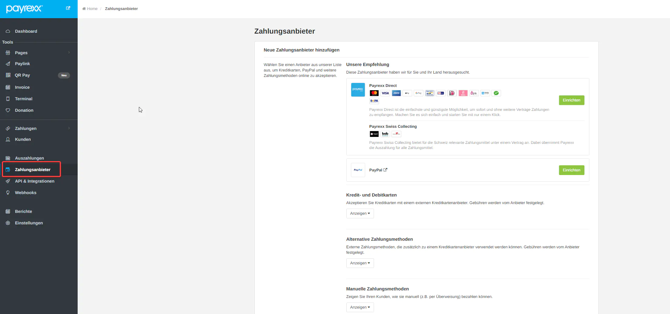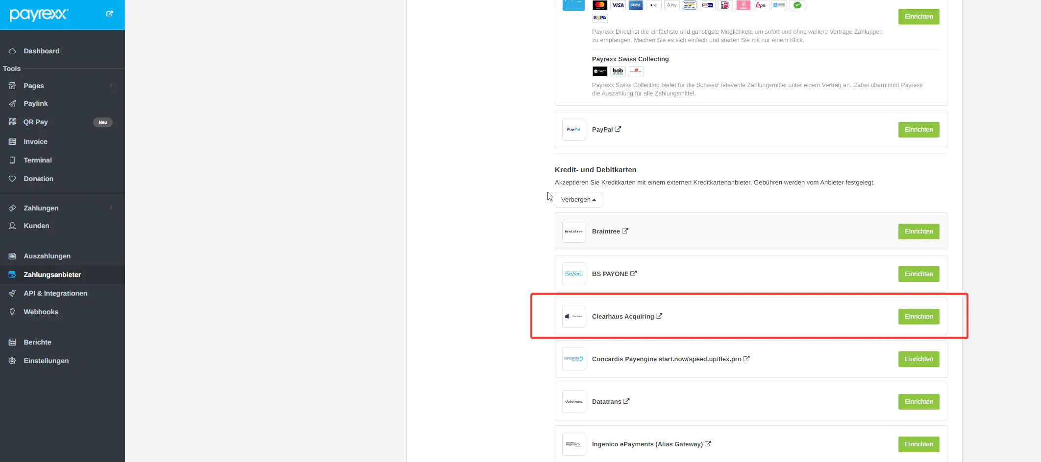 - Klicken Sie in Ihrem Payrexx Backend «Einstellungen > Zahlungsanbieter >Neue Zahlungsanbieter hinzufügen > Clearhaus einrichten».