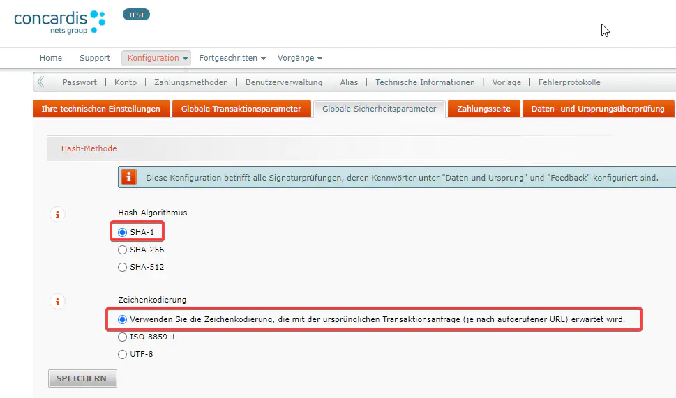 Navigieren Sie im Tabmenu nach «Globale Sicherheitsparameter» [1] und überprüfen Sie, ob unter «Hash-Methode» die Optionen «Jeder Parameter» [2], «SHA-1» [3] und «Verwenden Sie die Zeichenkodierung, die mit der ursprünglichen Transaktionsanfrage erwartet wird.» [4] aktiviert sind.