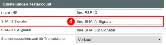 Navigieren Sie im Tabmenu nach «Daten- und Ursprungsüberprüfung [1]. Das Feld «URL der Händlerseite» [2] sollte immer leer sein. Die Sicherheit wird mittels der SHA-IN Signatur gewährleistet. Tippen Sie unter «SHA-IN-Signatur» [3] den Wert ein, welchen Sie im Payrexx-Backend unter «Home/Einstellungen/Zahlungsanbieter/ConCardis» im Feld «SHA-IN-Signatur» [4] hinterlegt haben. Der Wert für die «SHA-IN-Signatur» [4] kann frei gewählt werden. Klicken Sie dann auf «Speichern».