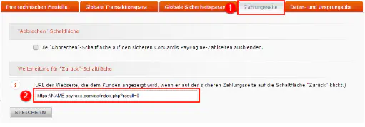 Navigieren Sie im Tabmenu nach «Zahlungsseite» [1] und fügen Sie unter «Weiterleitung für Zurück-Schaltfläche» [2] den Wert ein, welcher im untenstehenden Bild für dieses Feld eingetragen ist. Ersetzen Sie auch hier den Platzhalter «NAME» durch Ihre Subdomain. Klicken Sie dann auf den Button «Speichern».