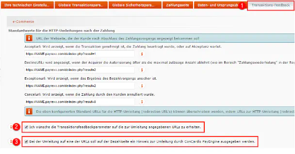 Navigieren Sie im Tabmenu nach «Transaktions-Feedback» [1]. Ersetzen Sie wiederum den Platzhalter «NAME» durch Ihre Subdomain.