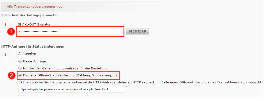 Fügen Sie als Nächstes unter «Alle Transaktionsübertragungsmodi» im Feld «SHA-OUT-Signatur» [1] den Wert ein, welchen Sie im Payrexx-Backend unter «Home/Einstellungen/Zahlungsanbieter/ConCardis» im Feld «SHA-OUT-Signatur» [3] hinterlegt haben. Der Wert für die «SHA-OUT-Signatur» [3] kann frei gewählt werden. Wählen Sie dann unter «HTTP-Anfrage für Statusänderungen» die Option «Für jede Offline-Statusänderung» [2] aus. Klicken Sie anschliessend auf «Speichern».