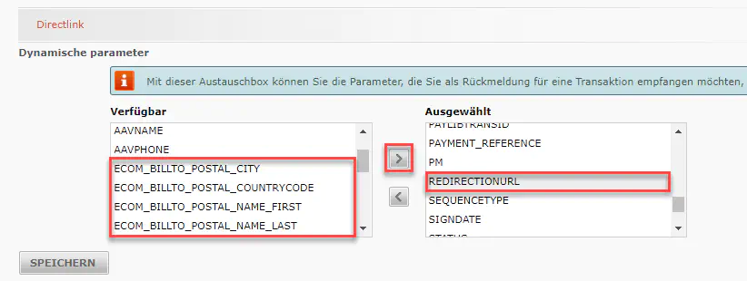 Verschieben Sie unter «Directlink» den «REDIRECTIONURL» und alle «ECOM_» Parameter auf die rechte Seite: