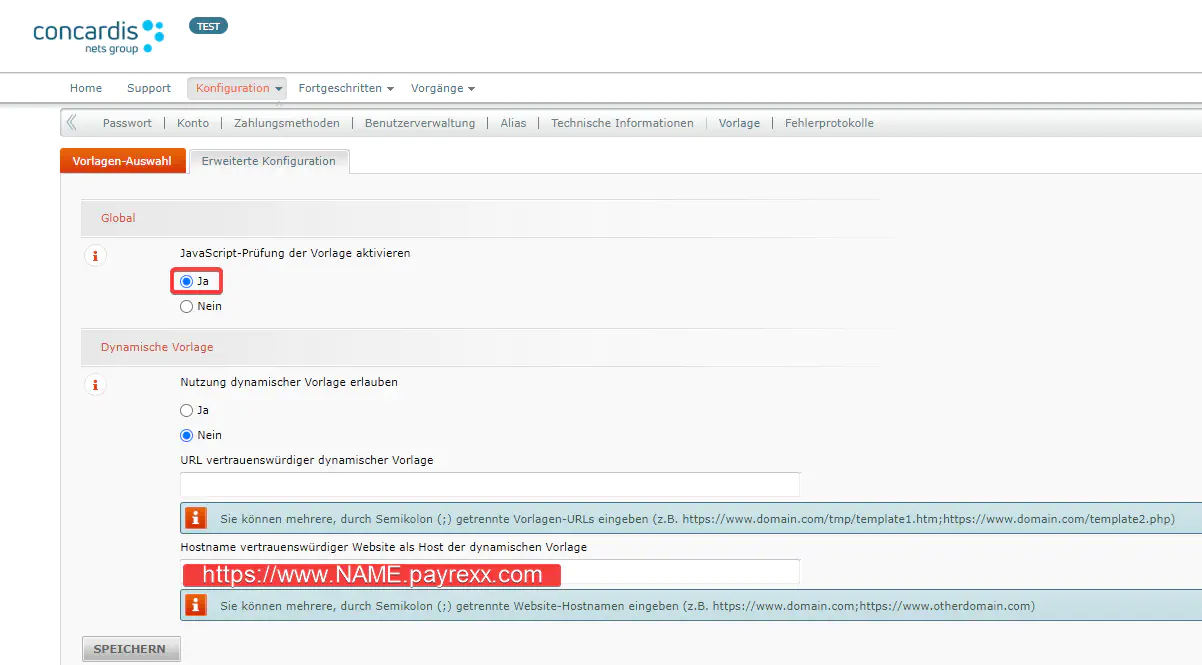Wählen Sie dann bei «Nutzung dynamischer Vorlagen erlauben» [1] «Ja» und tippen Sie beim Feld «Hostnamen vertrauenswürdiger Website als Host der dynamischen Vorlage» [2] den im Bild für dieses Eingabefeld abgebildeten Wert ein. Bitte beachten Sie, dass «NAME» durch die Subdomain, unter welcher Sie sich registriert haben, ersetzt werden muss. Klicken Sie dann auf den Button «Speichern».