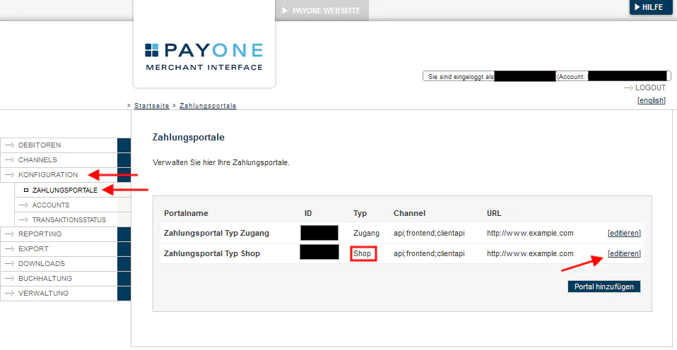 - «Konfiguration > Zahlungsportale» anwählen. Anschliessend beim Zahlungsportal vom Typ «Shop» auf «editieren» klicken: