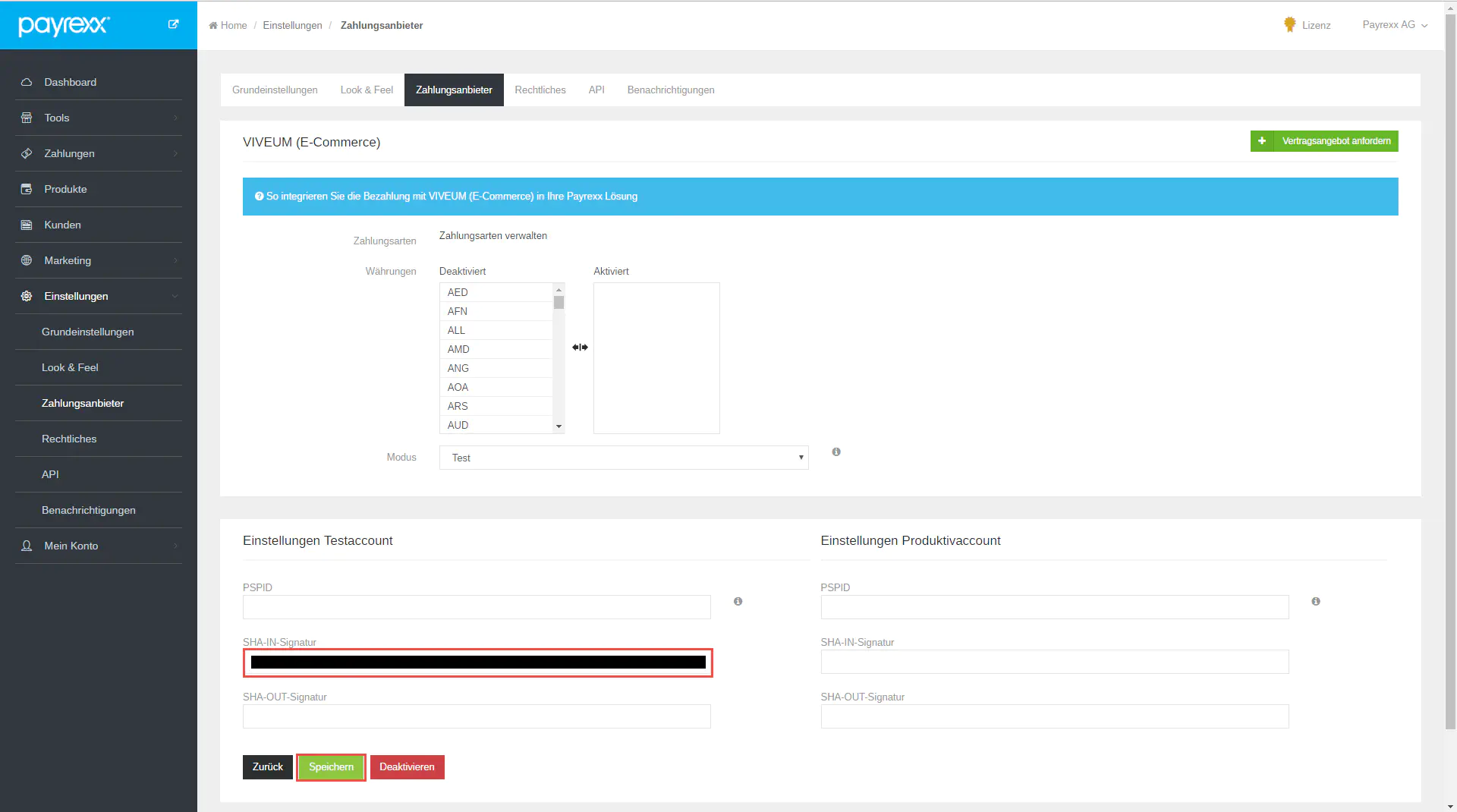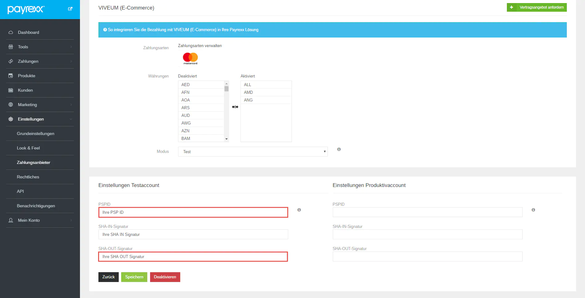 - Sie erhalten von Viveum eine E-Mail mit Ihren Zugangsdaten. Tragen Sie diese in die untenstehenden Eingabefelder unter Payrexx Testmodus ein. Wählen Sie dann die entsprechende Zahlungsarten sowie die aufgeschalteten Währungen aus. Klicken Sie «Speichern».