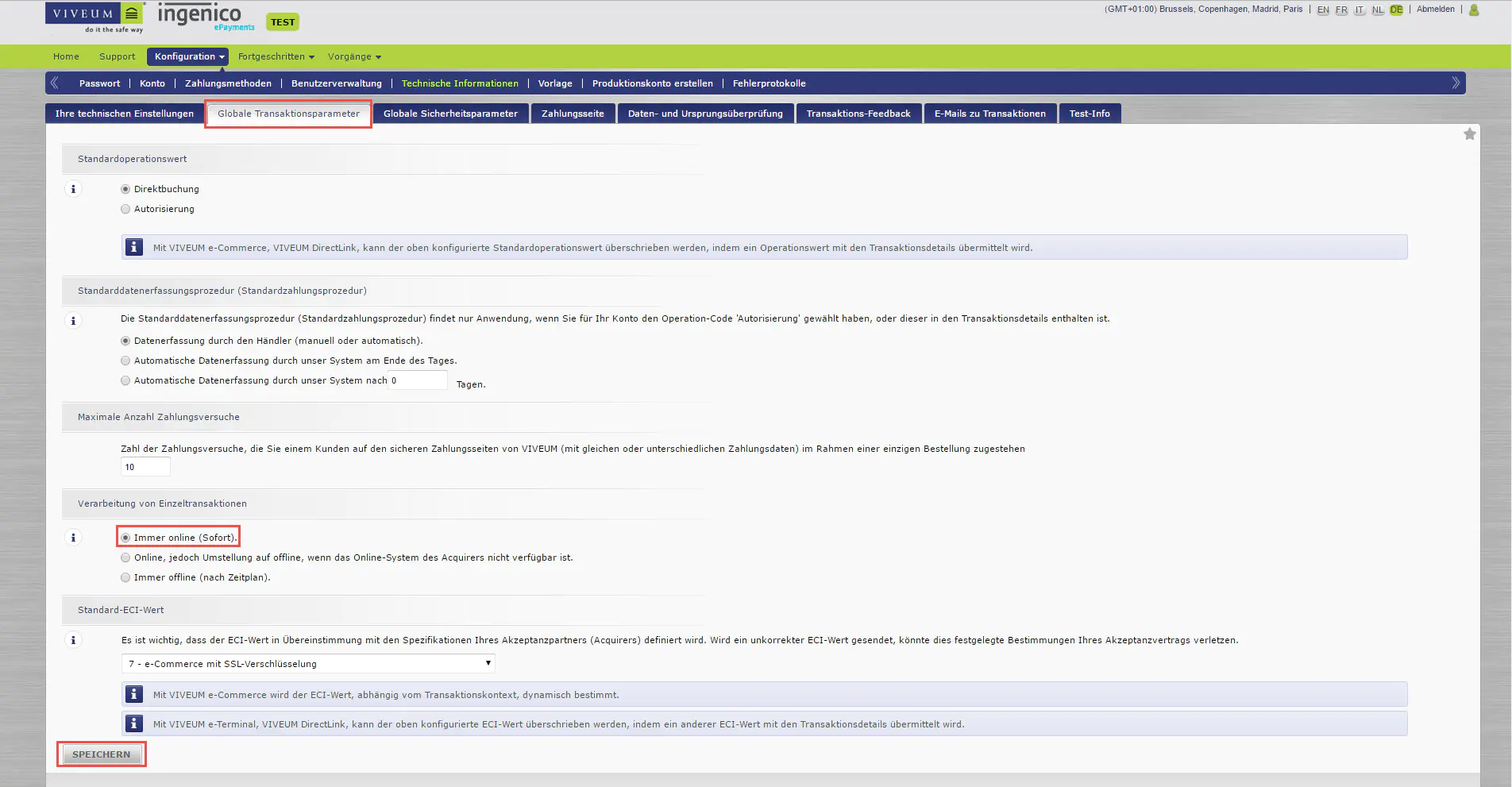 - Navigieren Sie im Tabmenu nach «Globale Transaktionsparameter» [1] und stellen Sie sicher, dass unter «Verarbeitung von Einzeltransaktionen» die Option «Immer online (Sofort)» [2] gewählt ist. Klicken Sie dann auf den Button «Speichern».