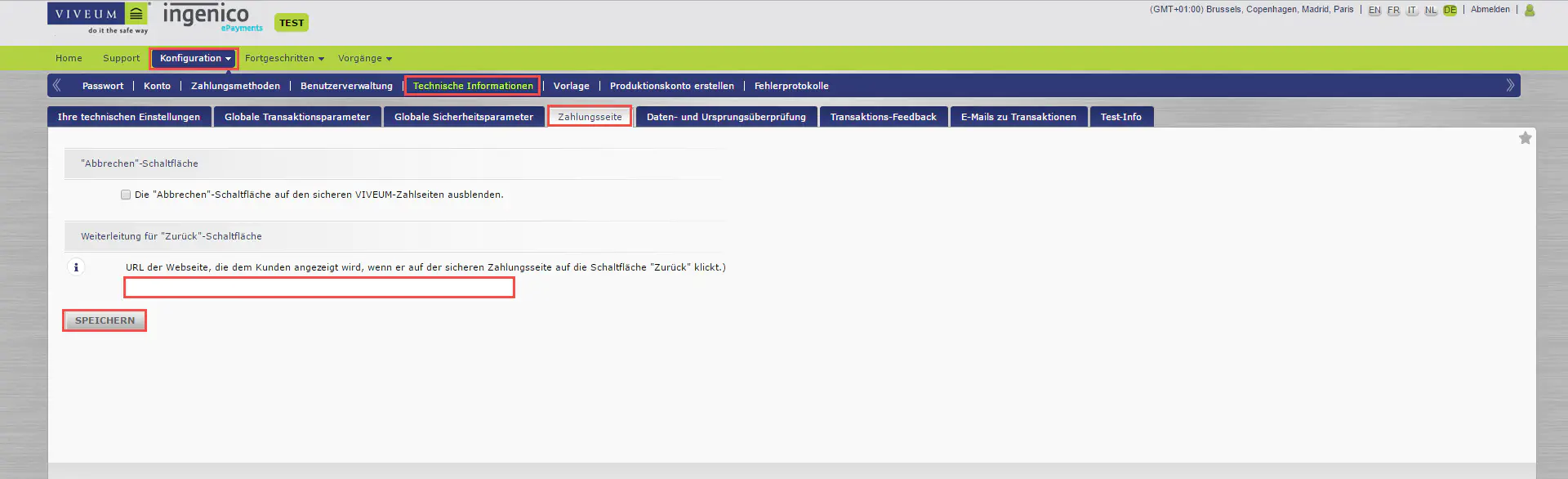 - Navigieren Sie im Tabmenu nach «Zahlungsseite» [1] und fügen Sie unter «Weiterleitung für Zurück-Schaltfläche» [2] den Wert ein, welcher im untenstehenden Bild für dieses Feld eingetragen ist. Ersetzen Sie auch hier den Platzhalter «NAME» durch Ihre Subdomain. Klicken Sie dann auf den Button «Speichern»