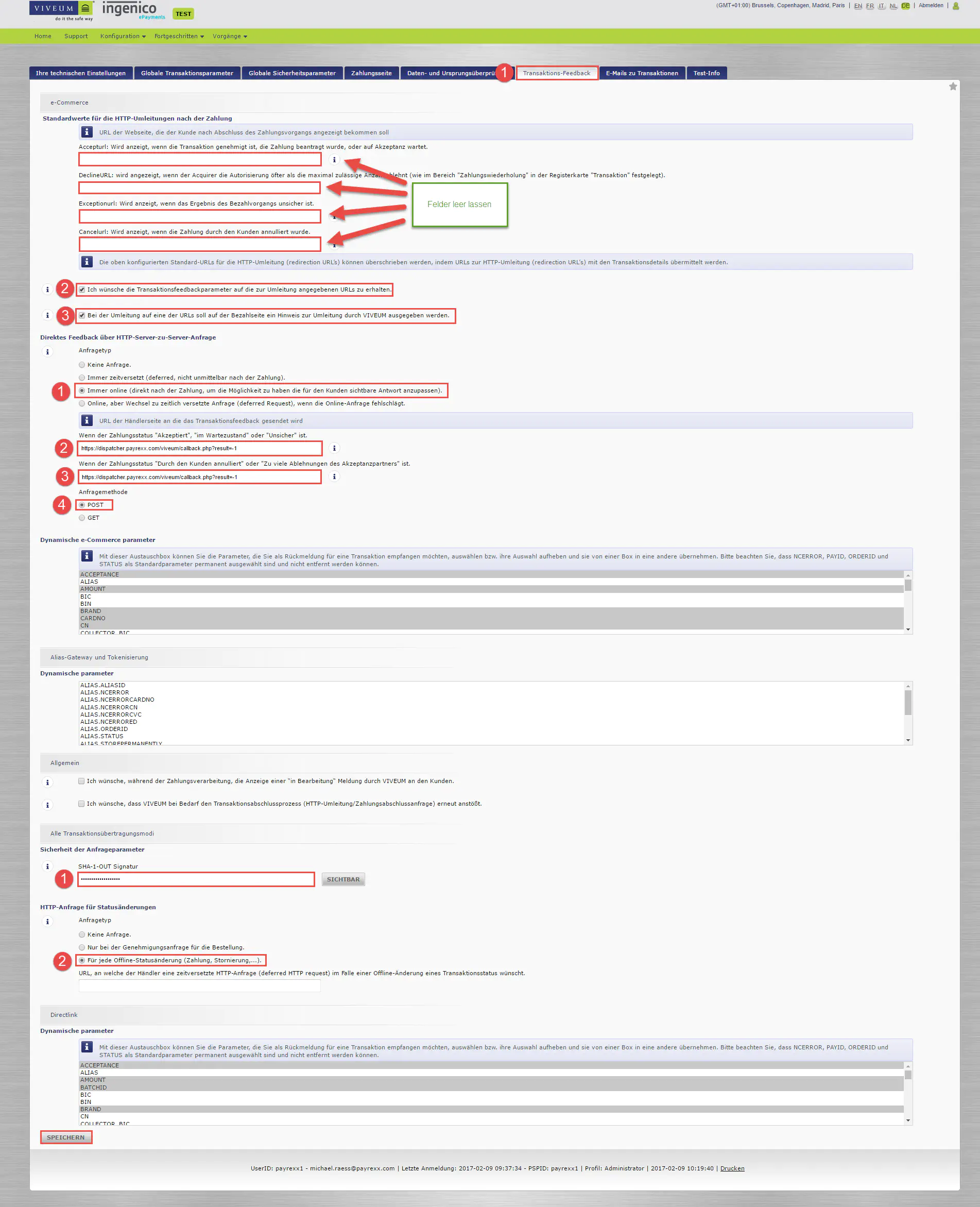 - Navigieren Sie im Tabmenu nach «Transaktions-Feedback» [1]. Ersetzen Sie wiederum den Platzhalter «NAME» durch Ihre Subdomain.