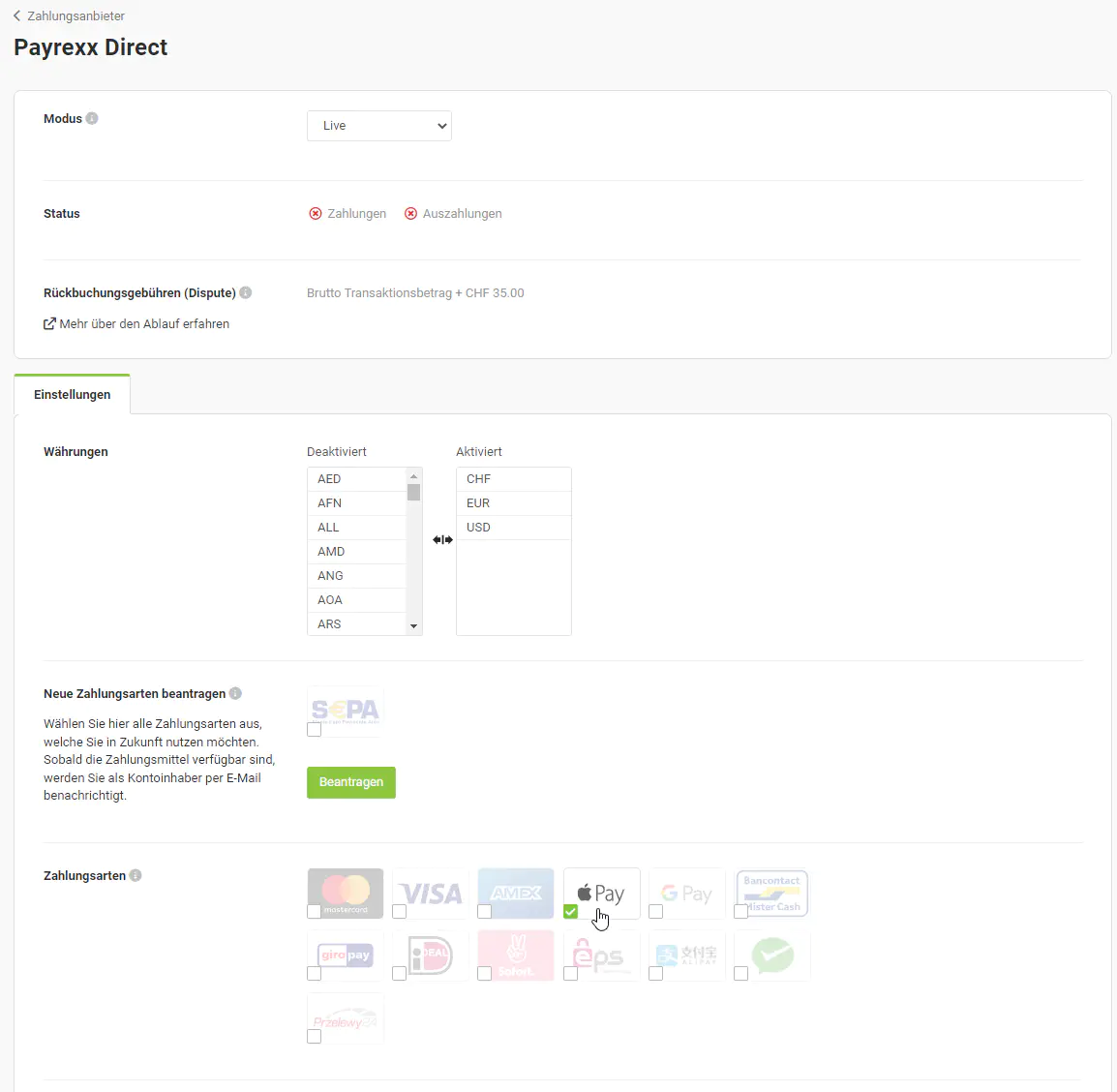 Aktivieren Sie Apple Pay als Zahlungsart in Ihrem Payrexx Konto, indem Sie in Ihrem Account unter Zahlungsanbieter > Payrexx Direct Apple Pay aktivieren.