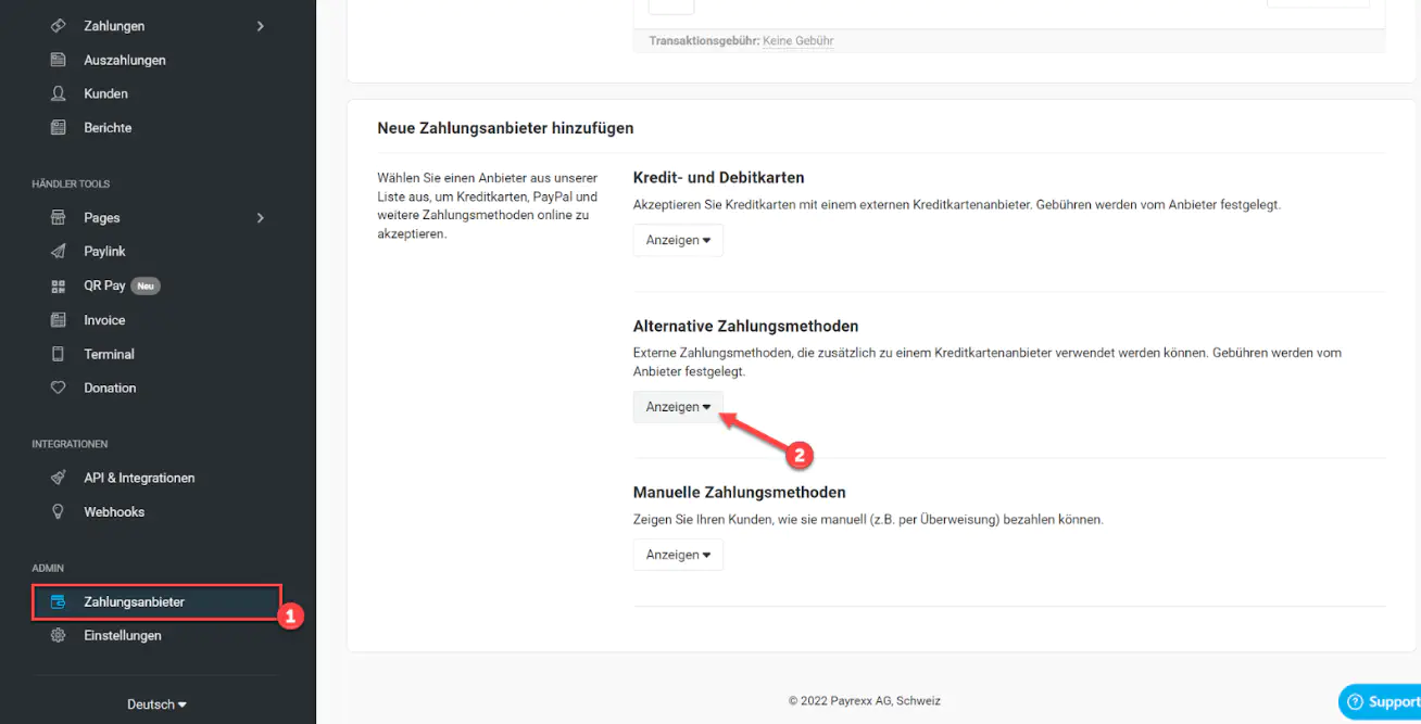 Klicken Sie in Ihrem Payrexx Backend “Zahlungsanbieter”, scrollen Sie nach unten und klicken Sie unter “Alternative Zahlungsmethoden” auf “Anzeigen”. Suchen Sie anschliessend in der Liste nach “Boncard” und klicken Sie auf “einrichten”.