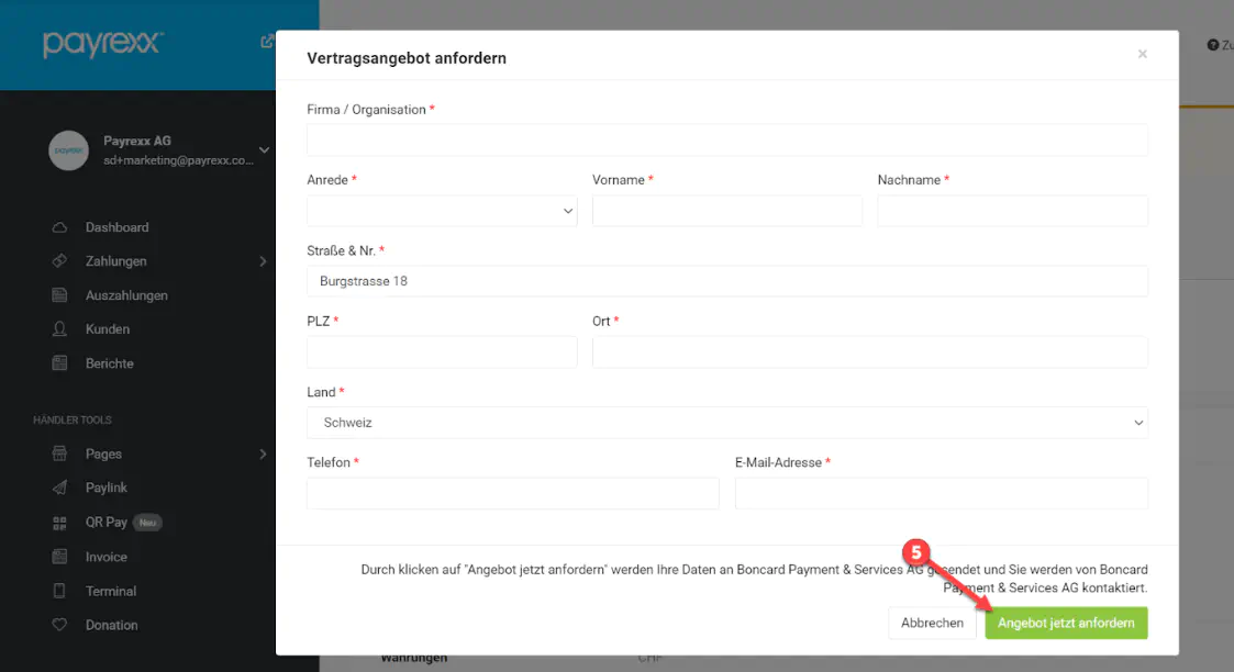 Sobald Sie dies gemacht haben, öffnet sich ein weiteres Formular, wo Sie folgende Daten eingeben müssen: - Firma / Organisation - Anrede, Vorname, Name - Strasse & Nr. - PLZ, Ort, Land - Telefon, E-Mail-Adresse Danach klicken Sie auf “Angebot jetzt einfordern”. Die Daten werden an Boncard übermittelt und Sie werden in den nächsten Tagen von einem/einer Boncard Mitarbeiter:in kontaktiert.