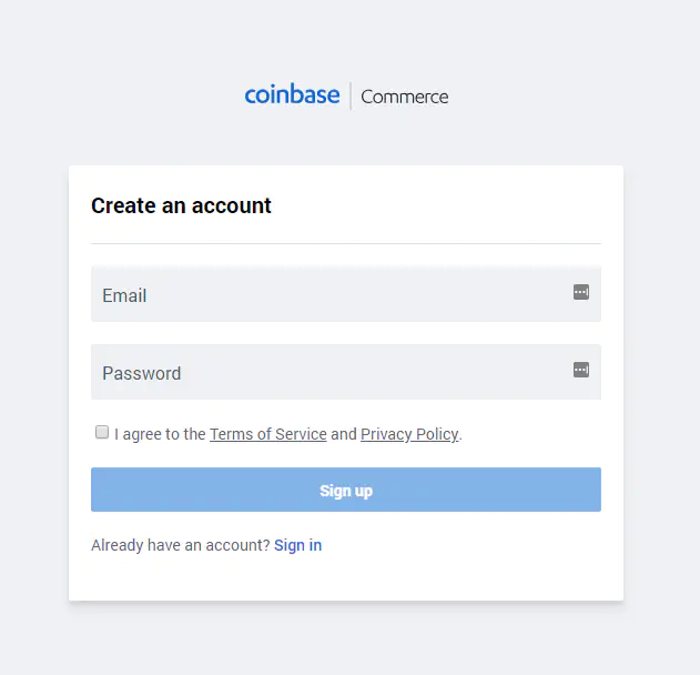 1. Erstellen Sie einen Coinbase Commerce Account: https://commerce.coinbase.com/signup.