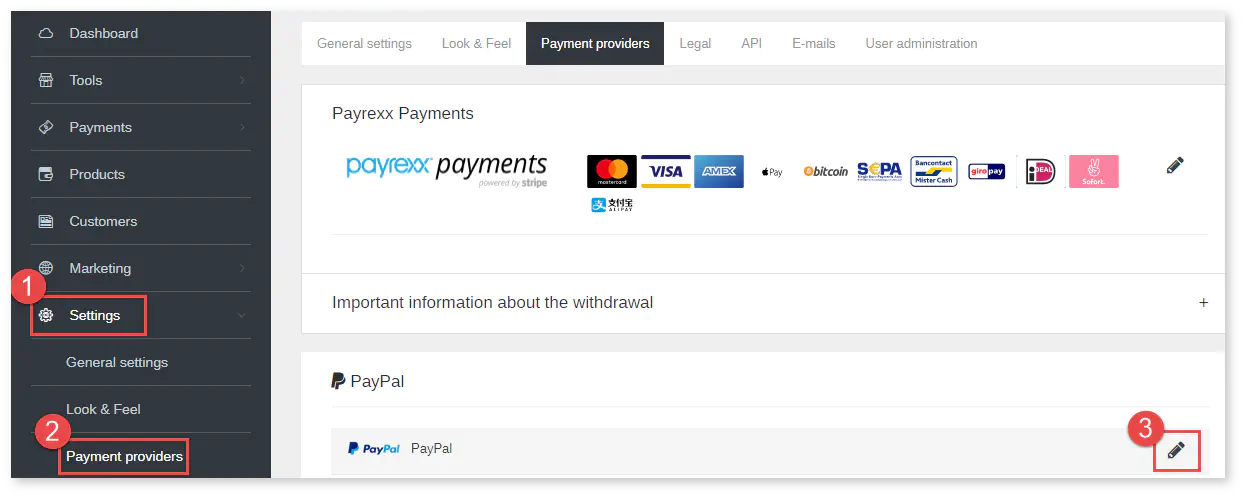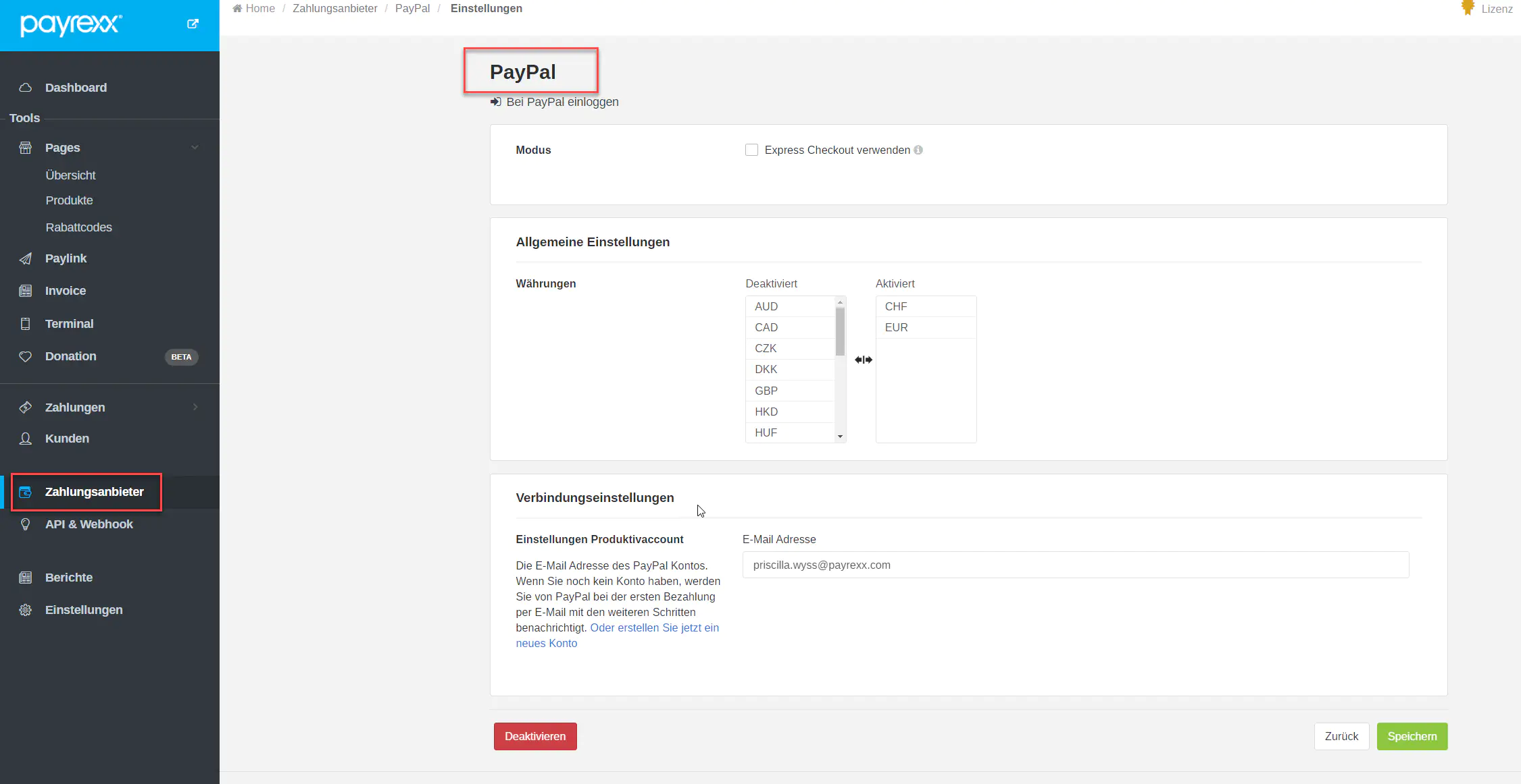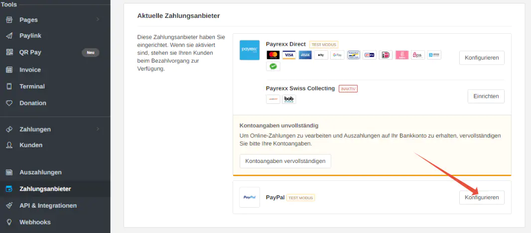 - Navigieren Sie in Ihrem Payrexx-Konto zu Zahlungsanbieter -> PayPal