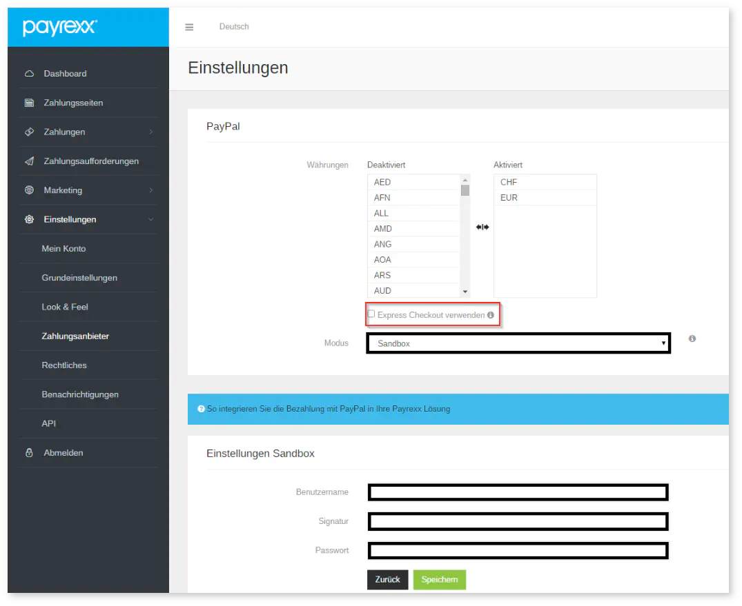 - Setzen Sie das Häkchen nicht bei “Express Checkout verwenden”.