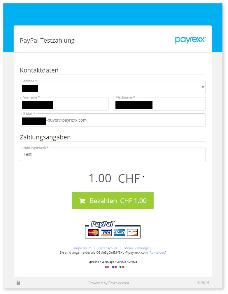 Danach erstellen Sie ein Test-Zahlungsformular mit PayPal als Zahlungsanbieter. Füllen Sie die Kontaktdaten aus und betätigen Sie den Zahlungsbutton.