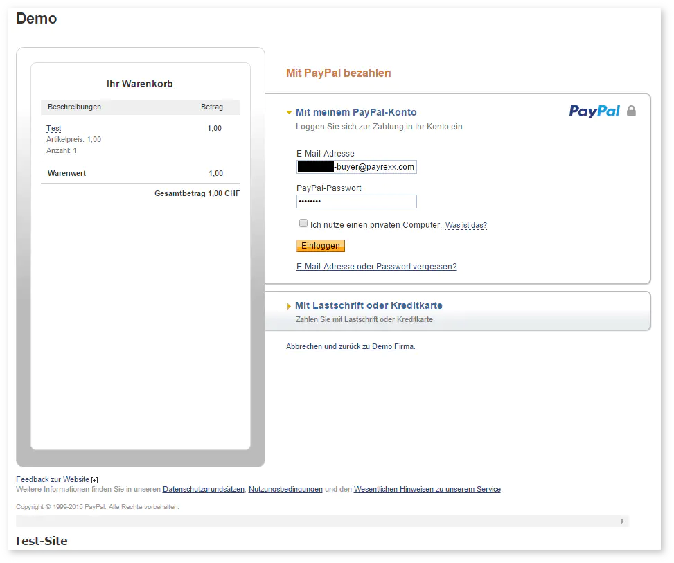 Um die Testzahlung abzuschliessen, setzen Sie Ihre PayPal Personal (-buyer@) E-Mail-Adresse mit Ihrem Passwort ein.