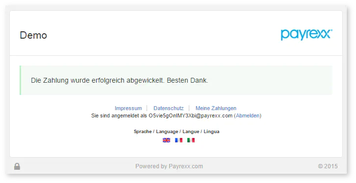 Anschliessend sollten Sie zurück zu Ihrer Payrexx-Seite gelangen und die Nachricht erhalten, dass die Zahlung erfolgreich abgewickelt wurde.