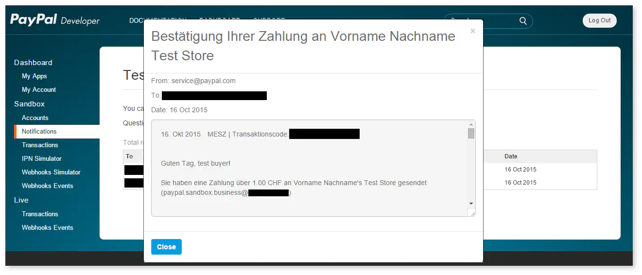Auf der PayPal Developer Website unter «Sandbox > Notifications» sehen die Bestätigung Ihrer Testzahlung.