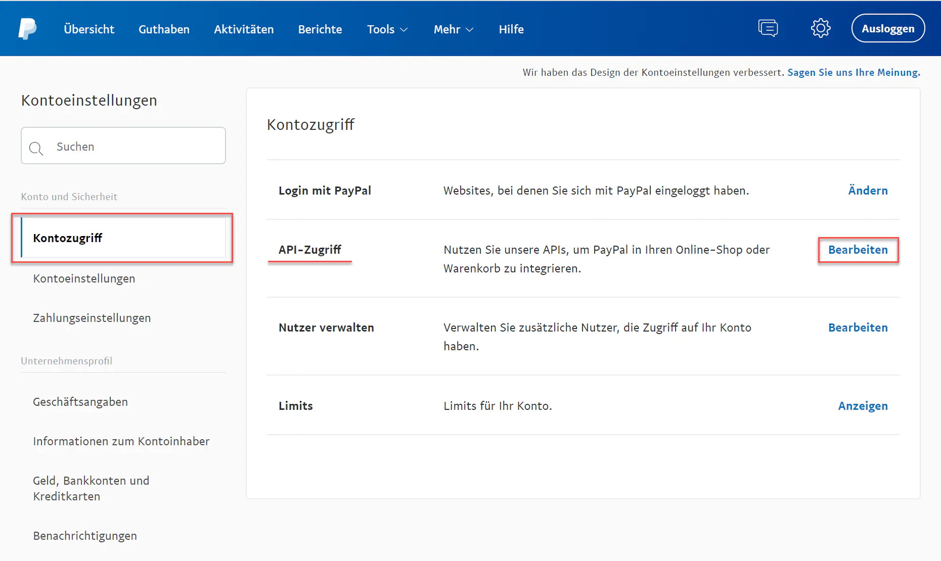 Im Tab «Kontozugriff» wählen Sie «API-Zugriff» und klicken Sie auf «Bearbeiten».