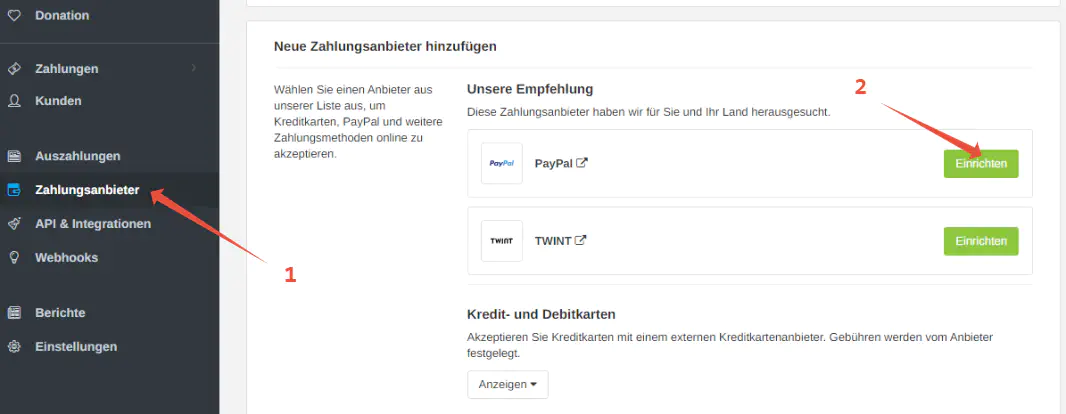Navigieren Sie in Ihrem Payrexx Dashboard zu «Zahlungsanbieter» und fügen Sie PayPal als Zahlungsanbieter durch Anklicken des Buttons «Einrichten» hinzu.
