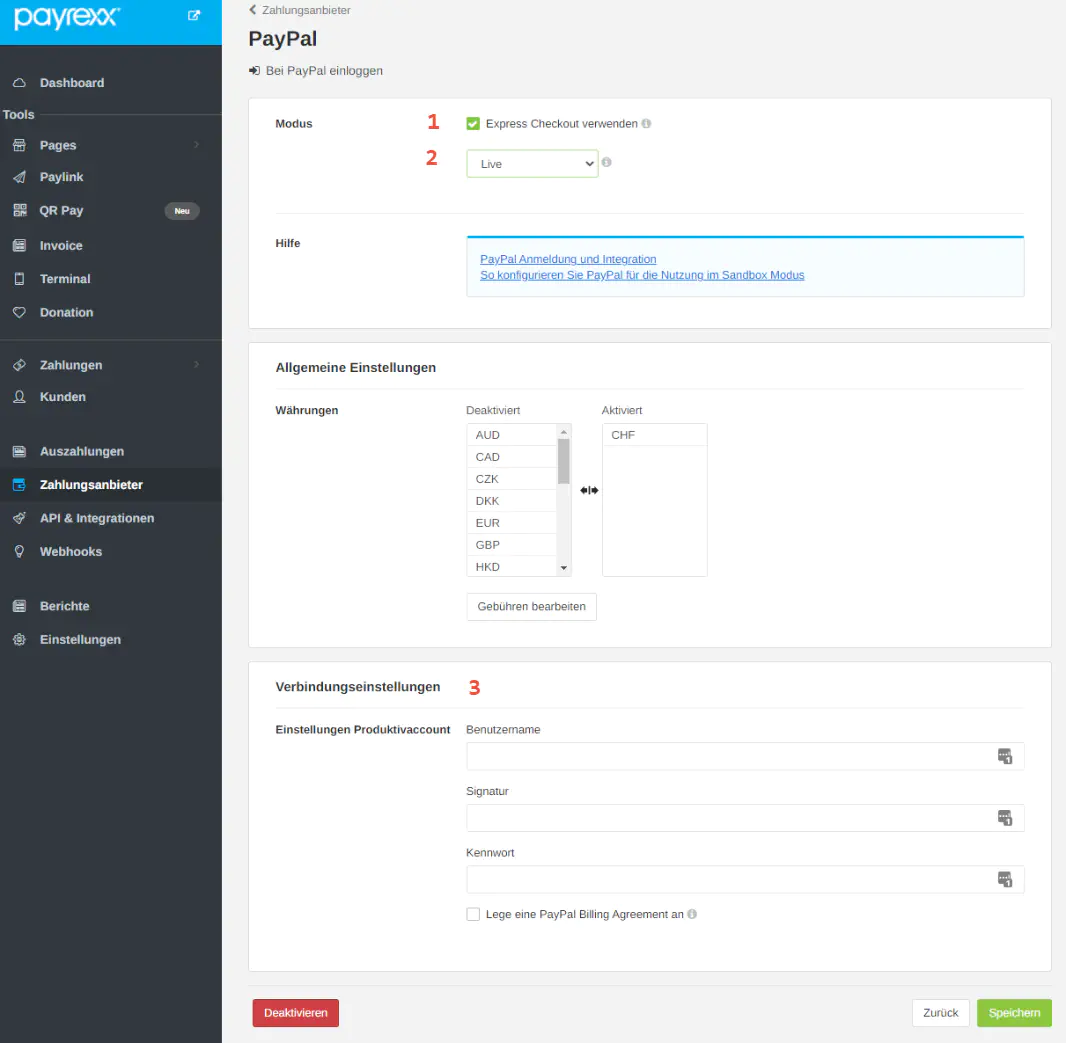 Setzen Sie das Häkchen bei 1 «Express Checkout verwenden» und wählen Sie 2 den Modus «Live». Tragen Sie die Zugangsdaten in die unten stehenden Eingabefelder 3 ein. Bestätigen Sie mit «Speichern». Bitte beachten Sie, dass die Reihenfolge der Eingabefelder bei Payrexx von denjenigen der Anzeige bei PayPal abweicht.
