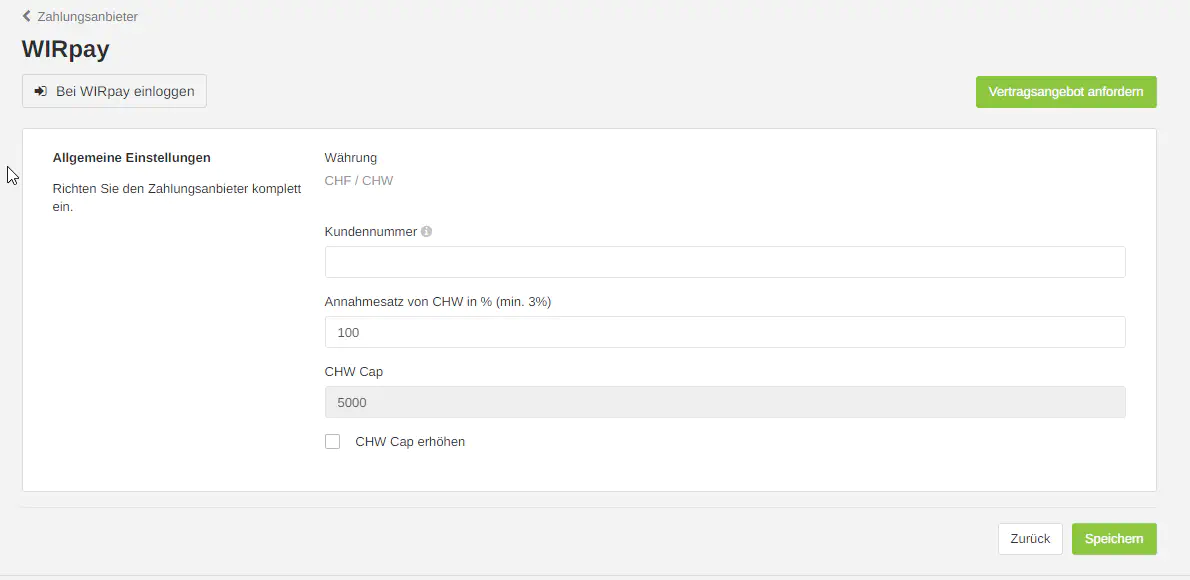 - Fügen Sie Ihre Kundennummer und den gewünschten WIR-Annahmesatz ein. (Der Maximalbetrag von CHW 5000 kann bei bedarf erhöht werden. Dazu klicken Sie auf «CHW Cap erhöhen»)
