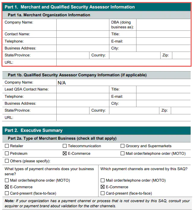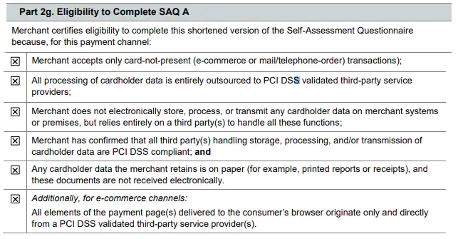 Lesen Sie den Abschnitt Eligibility to Complete SAQ A sorgfältig durch. Wenn Sie mit einem der Punkte nicht einverstanden sind, müssen Sie wahrscheinlich eine andere Selbstauskunft ausfüllen. Bitte wenden Sie sich in diesem Fall an unseren Support.