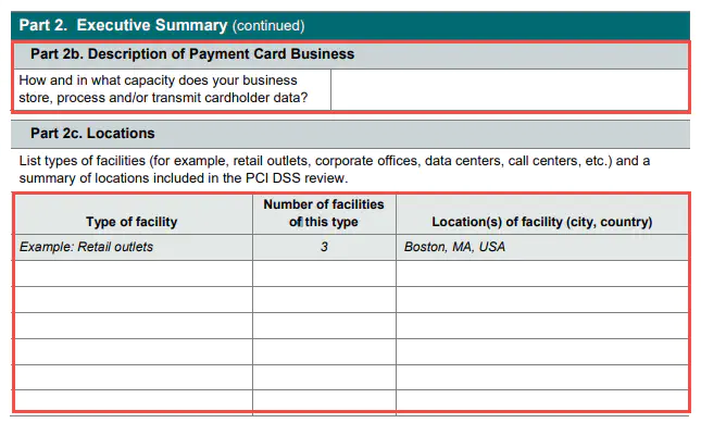 Geben Sie eine Beschreibung Ihres Geschäfts in Bezug auf Zahlungskarten unter Description of Payment Card Business ein. Ausserdem müssen Sie Ihre Firmensitze angeben, sowie die verwendeten Datenzentren Ihrer Webanwendung, sofern Sie Payrexx in Ihr System integriert haben.