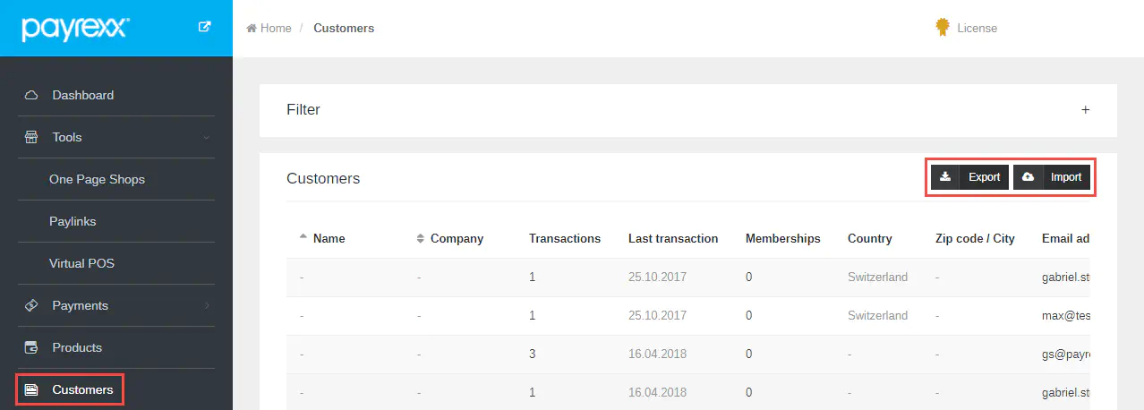 You can import and export customer data in your Payrexx administration. To do so, head to “Customers” in your Payrexx backend: