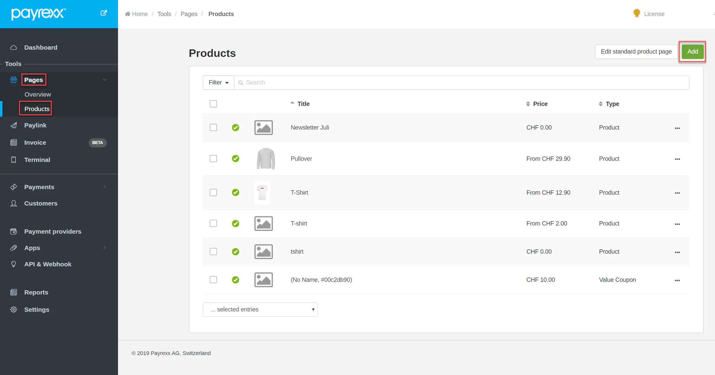 1. Sign in to your Payrexx-Account on www.payrexx.com. Go to your Backend and add a new product.