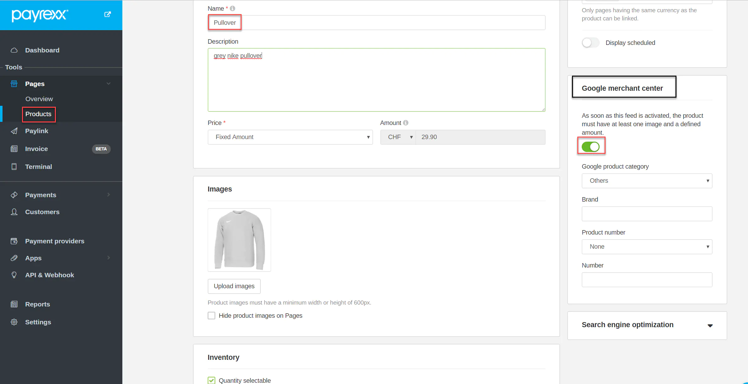 2. Add your product information and activate the option “Google Merchant Center” on the right. Fill in the fields and save your product.