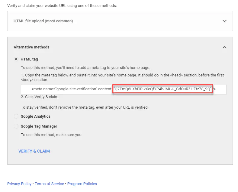 3. Verify and claim your website URL by choosing “HTML tag” as an “Alternative method”. Copy the link between the quotation marks, which appears after “content=”.