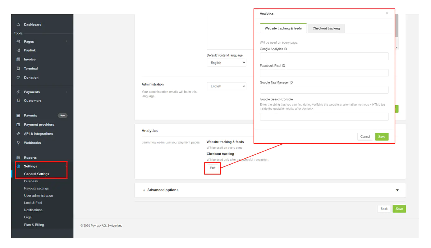 4. Add the copied link into the field “Google Webmaster Tools” under Settings > General Settings > Analytics (Edit) > Website Tracking and Analyse Feeds