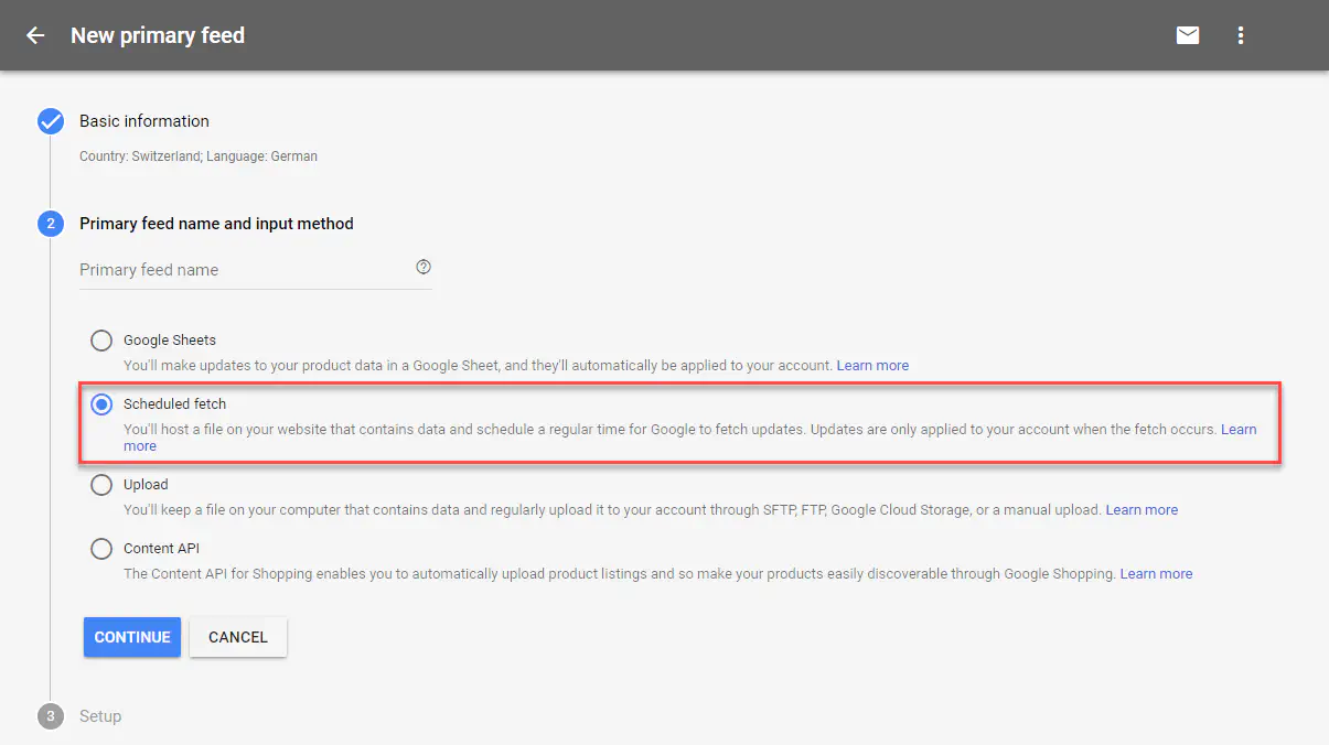 8. Choose “Scheduled Fetch” as a “Primary feed name and input method”.
