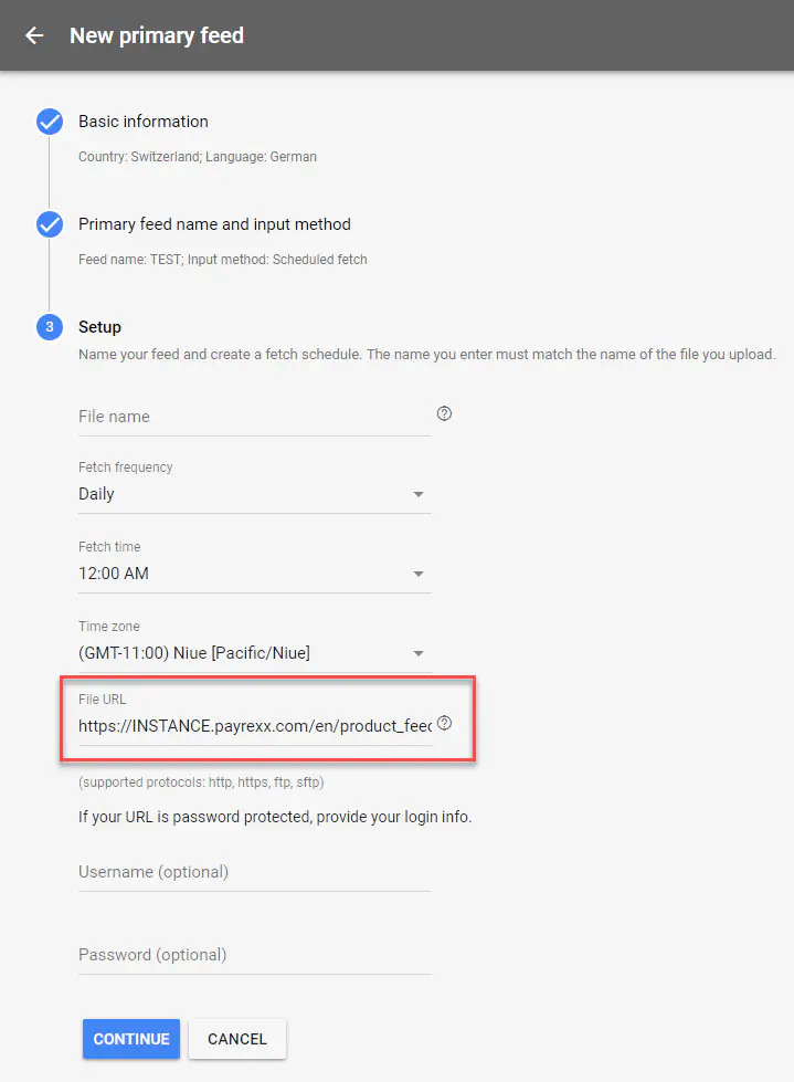 9. Under “Setup” insert the following File URL with your instance name: https://INSTANCE.payrexx.com/en/product_feed.xml.