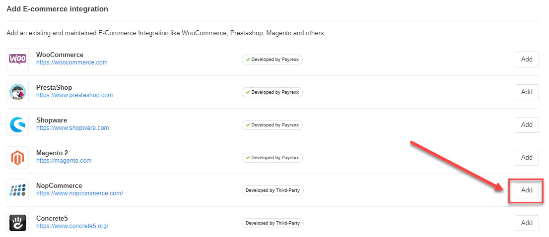 Now add NopCommerce under “Add E-Commerce Integration”.