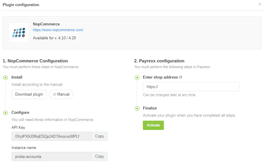 Fill in your shop address in the plugin configuration under “Enter shop address”. Under configure, you will also find the API key and instance name required by NopCommerce.