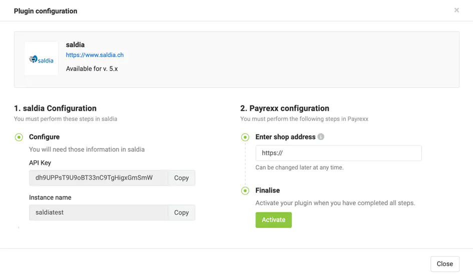 - When executing step 1, a modal window opens in the Payrexx Administration with the plugin configuration. Take the API key and the instance name (or account name) and copy this data into the configuration of saldia (this is described in step 3).