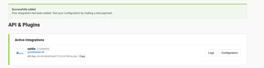 - Under the menu item “API & Integrations” the integration “saldia” is added