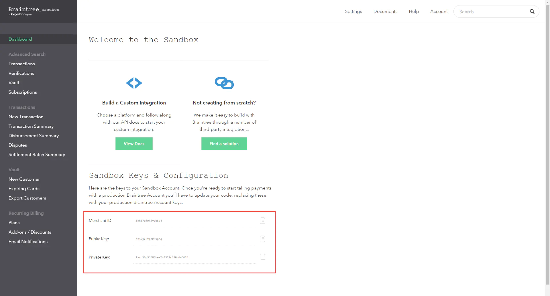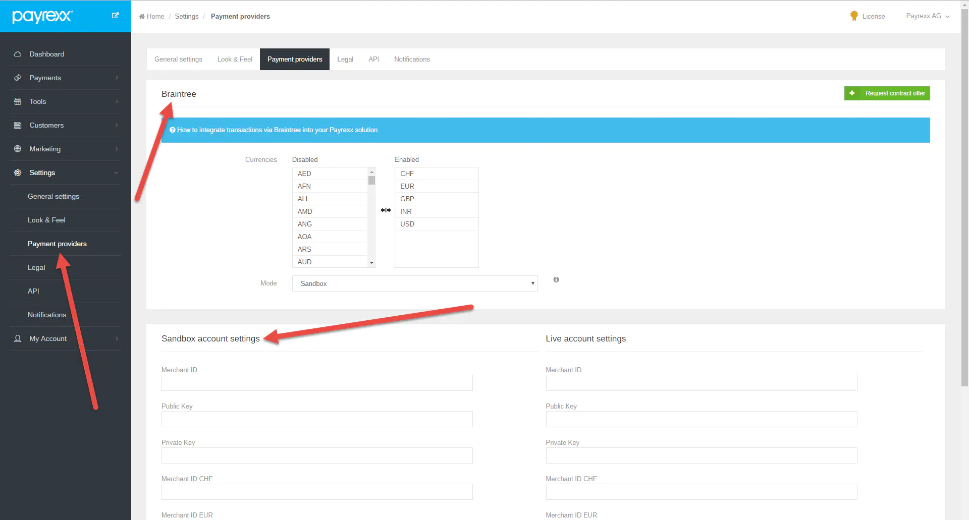 - Copy the “Sandbox Keys & Configuration” data from the Braintree account and paste it into your Payrexx account by configuring Braintree as your payment service provider.