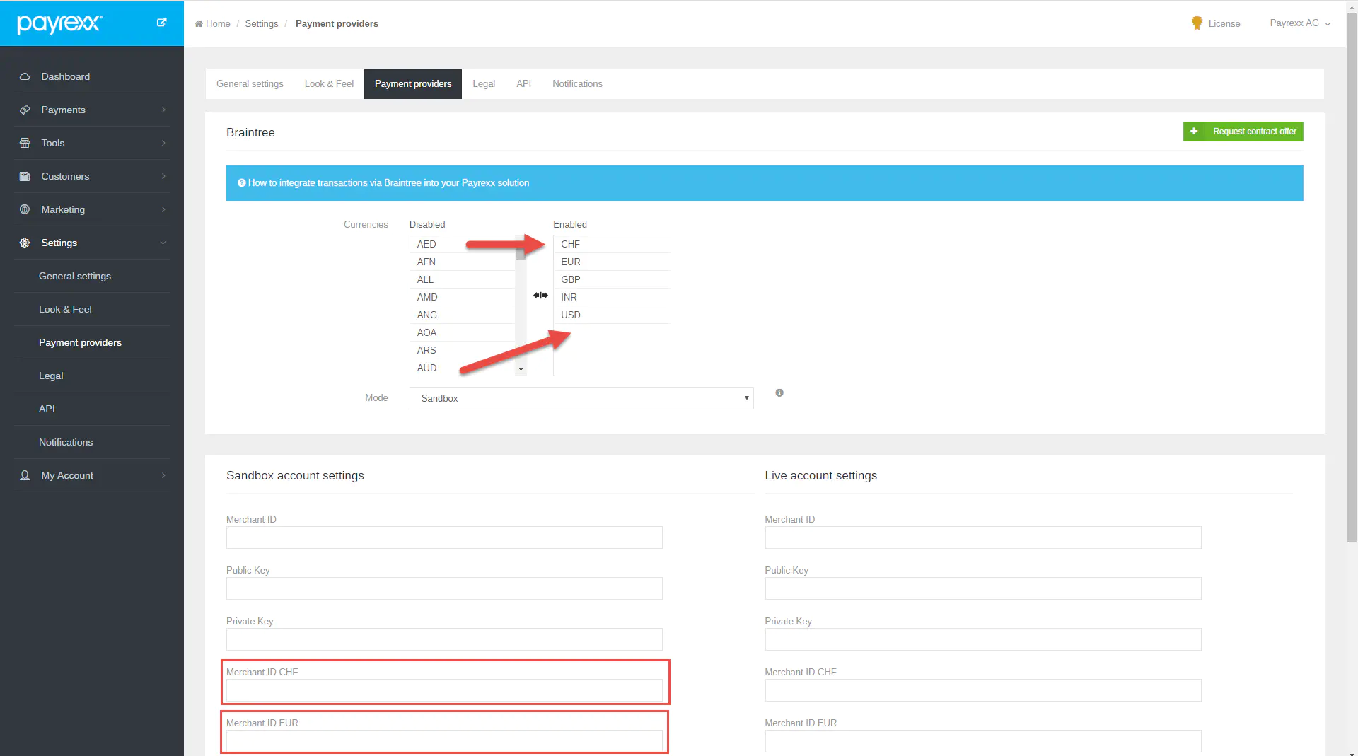 - Copy and paste your “Merchant account IDs” for new currencies from your Braintree account to your Payrexx account.