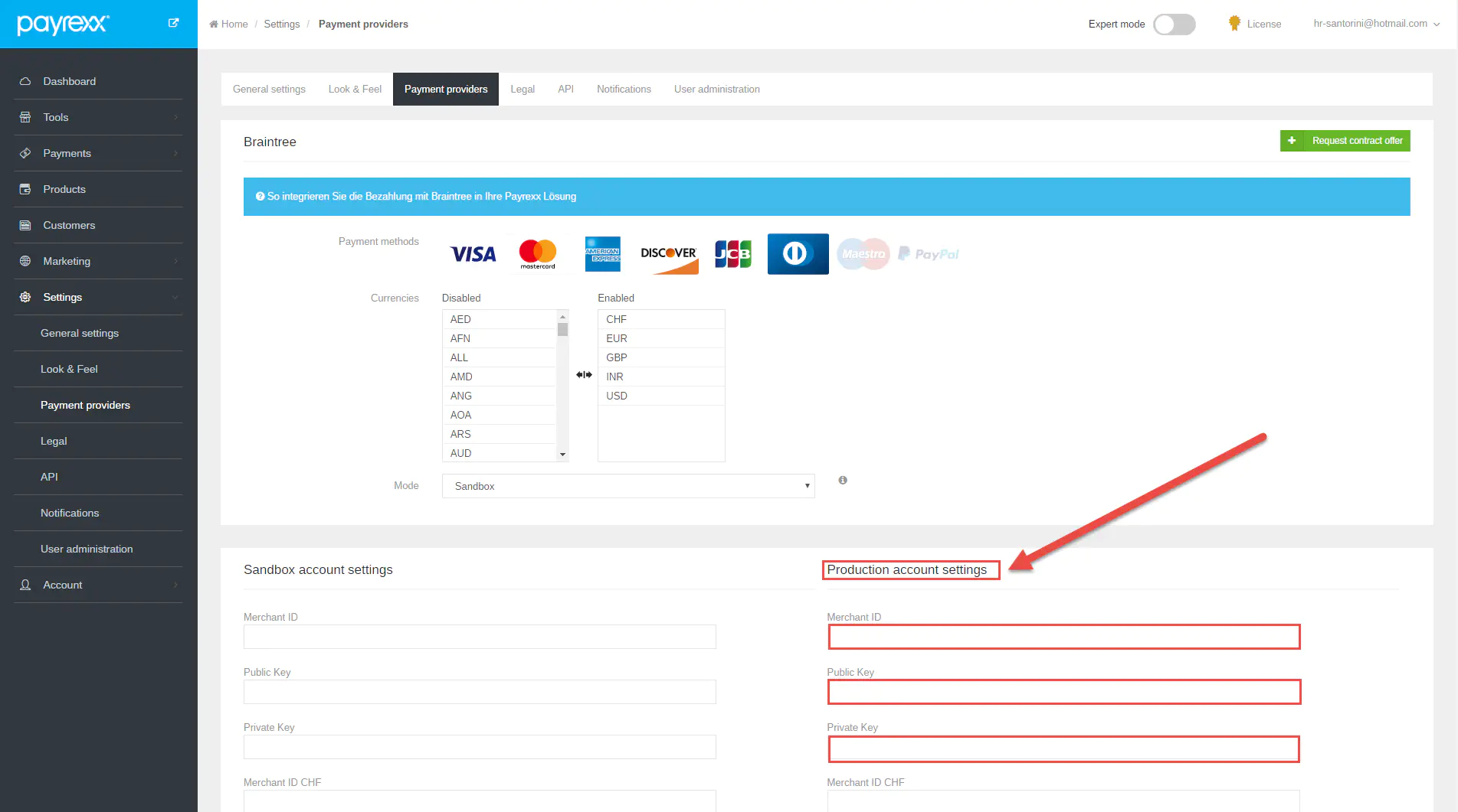- Once your Braintree is confirmed you can enter the productive Braintree account data into your Payrexx account: