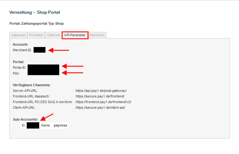 Under the slider “API-Parameter” you can copy the fields “Merchant-ID”, “Portal-ID”, “Key” and “Account-ID”.