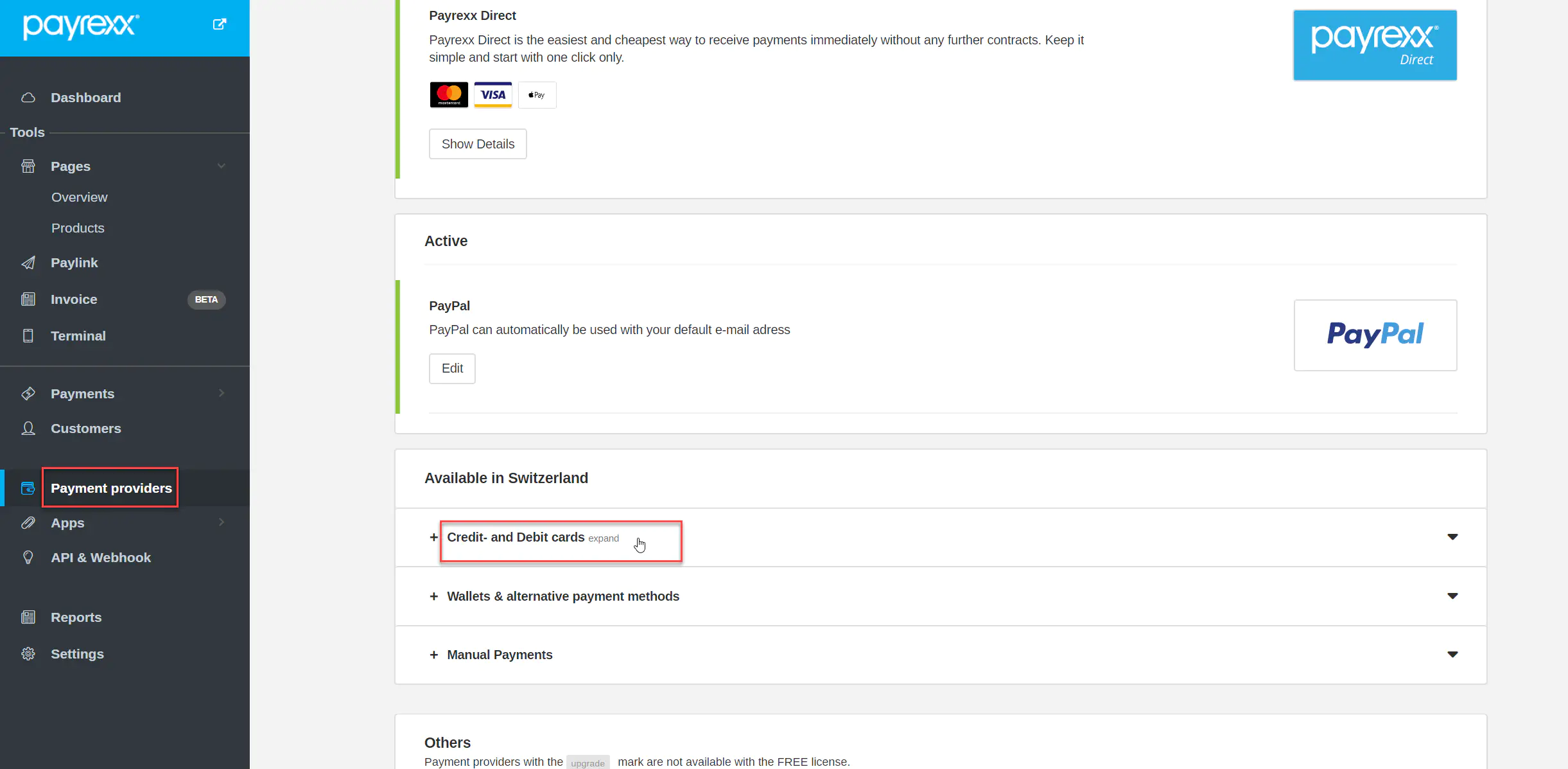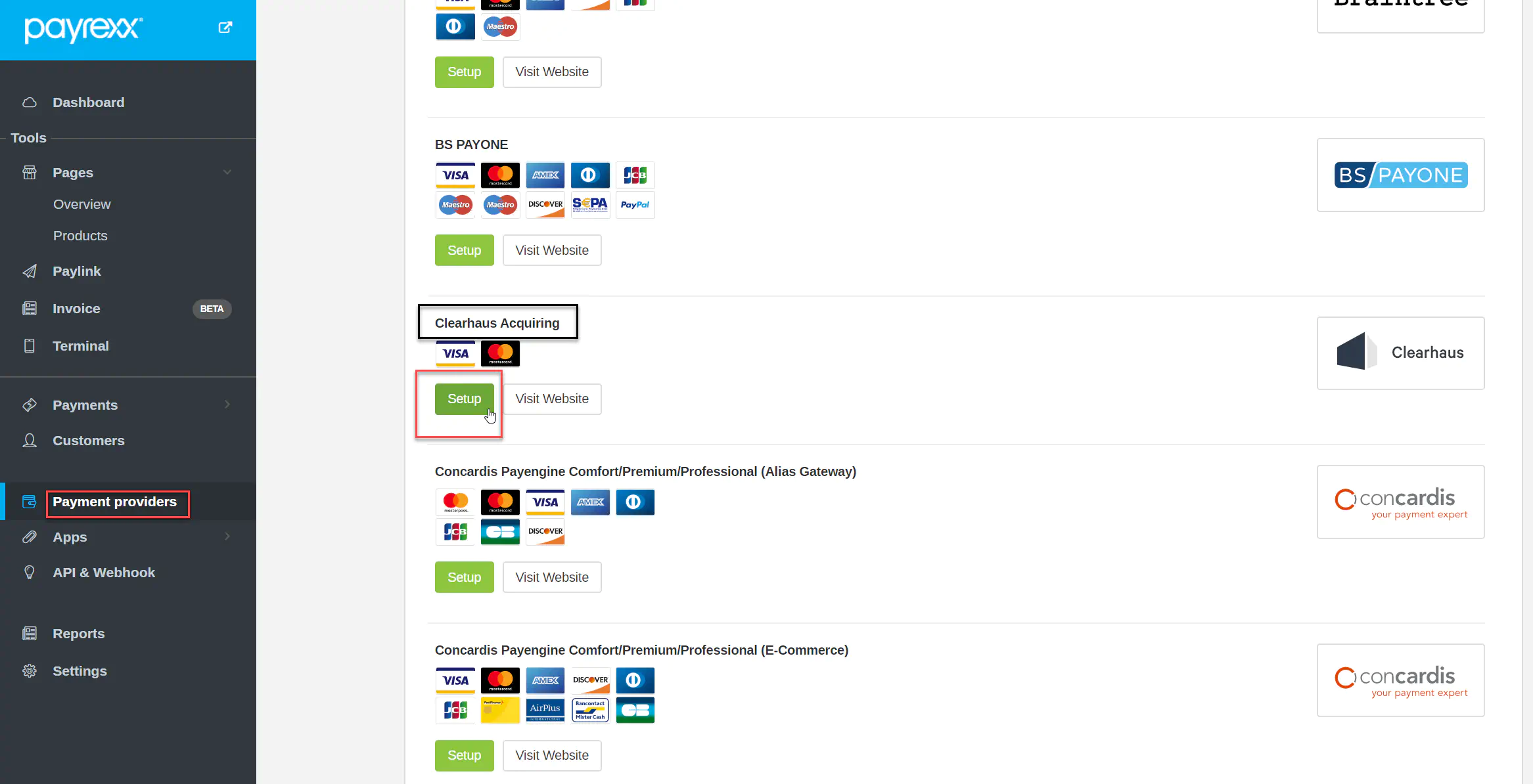 - In your Payrexx Backend navigate to: “Payment providers > Credit- and Debit cards > Clearhaus Acquiring > Setup”