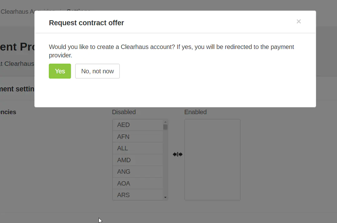 - As soon as you clicked on “Setup” a pop-up window appears. Click “Yes” to create a Clearhaus account.