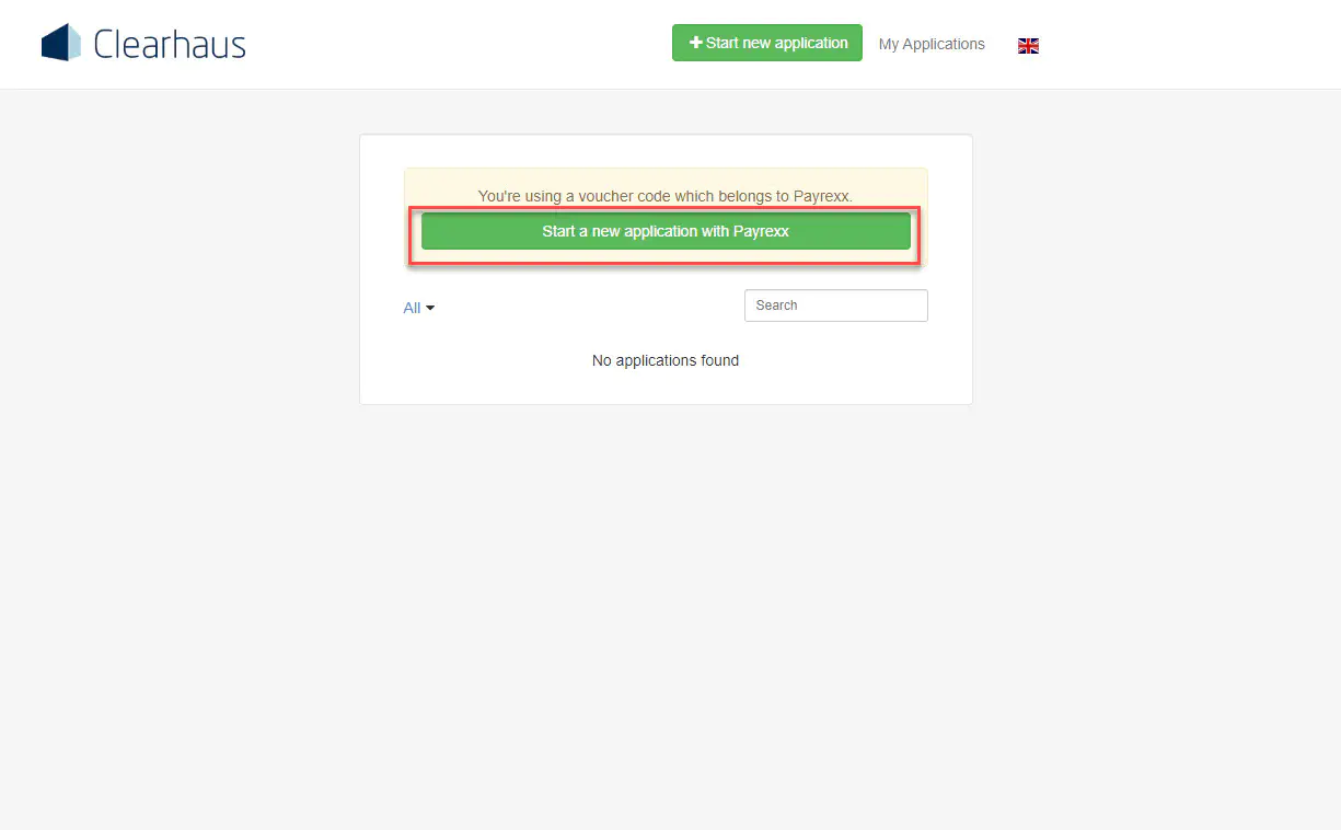- You will receive an e-mail to confirm your e-mail address. Then you have to create a new application. To do this, click on “Start a new application with Payrexx”.