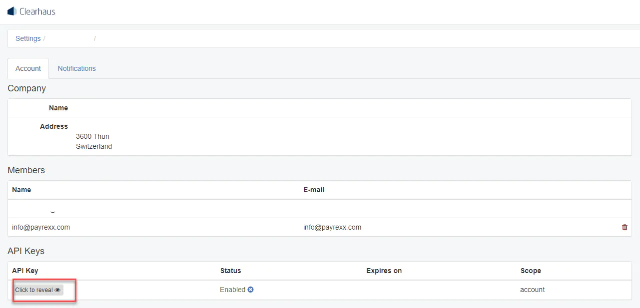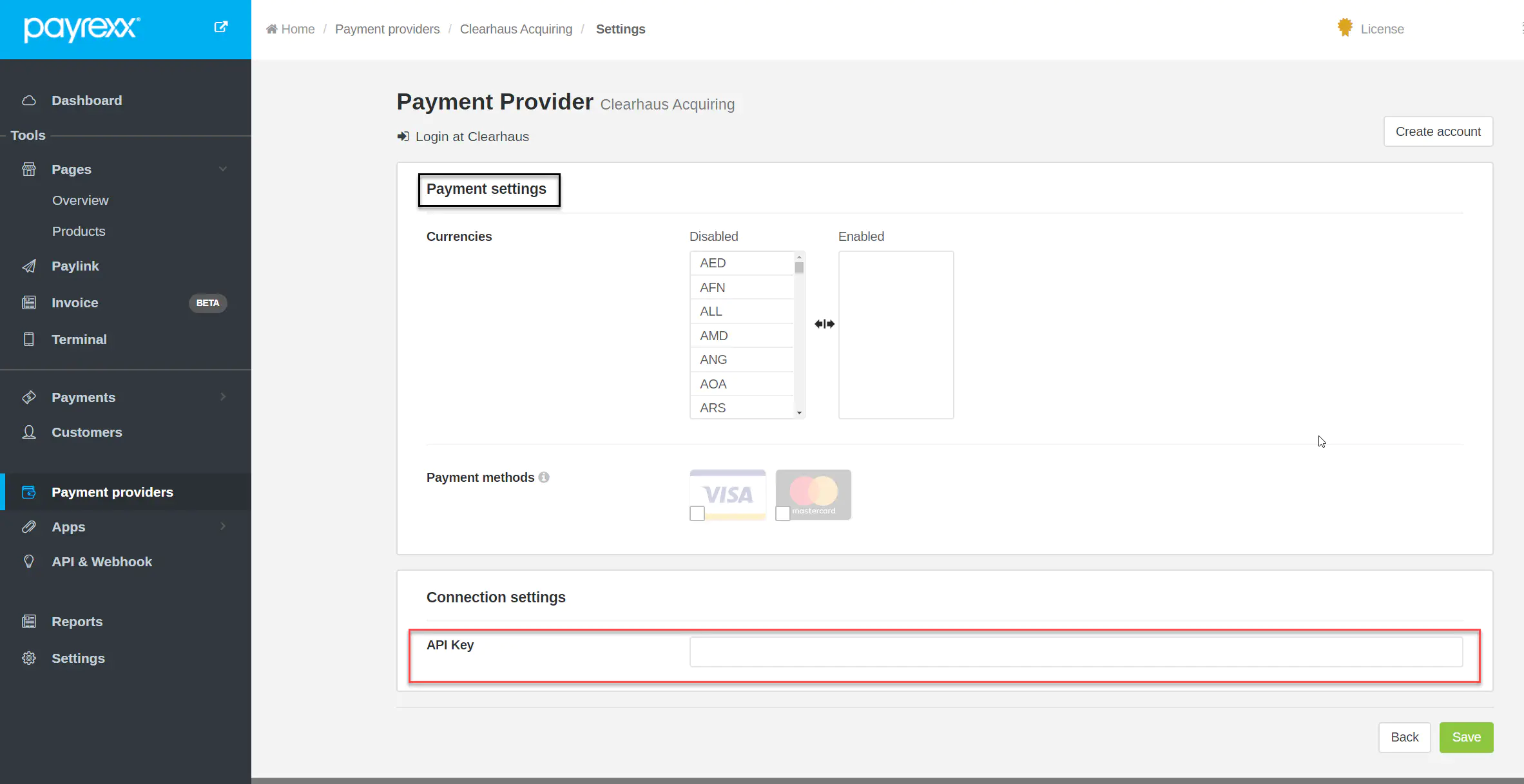 - The “API Key” then has to be inserted into your Payrexx account under ‘Clearhaus Acquiring > Connection Settings > API Key". Once you have done this, click “Save”.
