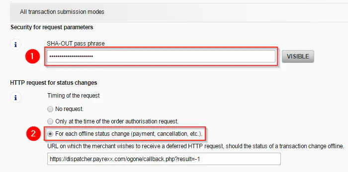 Enter the value for “SHA-OUT pass phrase” 1 in the section “All transaction submission modes” which you have defined in the Payrexx administration in “Home > Settings > Payment providers > PostFinance” in the field “SHA-OUT signature”. Select the option “No request” 2 for the setting “HTTP request for status changes”. Then click on the button “Save”.